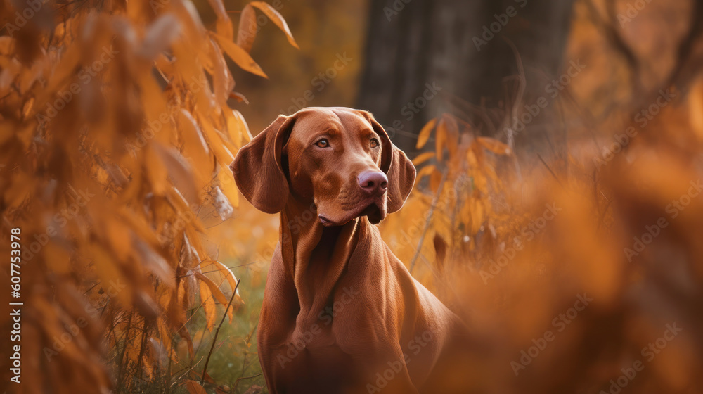 Hungarian hound pointer Vizsla dog in the field during autumn time, its russet-gold coat blending seamlessly with the fall leaves around it #607753978