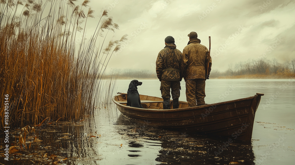 Hunters with a black labrador on a lake with reeds and a hunting boat #1188705146