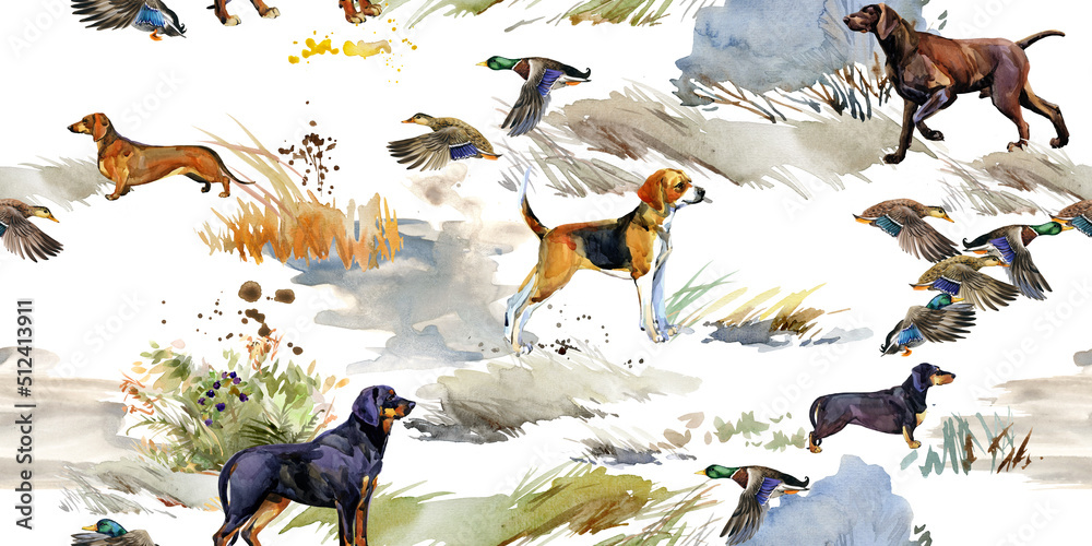 hunting dogs and Ducks seamless pattern. Greyhound dog breed illustration. hunting dogs watercolor illustration. Duck hanting #512413911