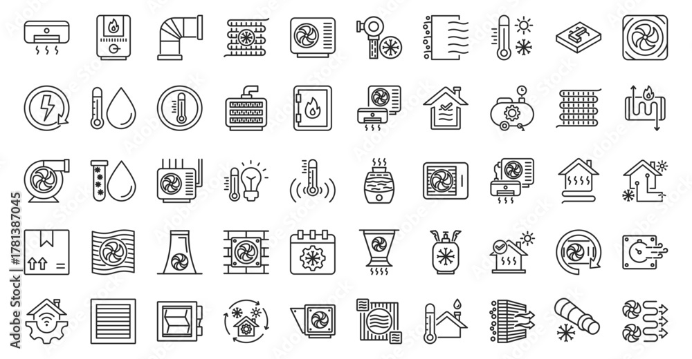 HVAC icon set outline containing air conditioning, heating system, ventilation duct, cooling coil, heat pump, refrigerant line, filter, thermostat control, ductwork design, energy recovery, humidity #1781387045