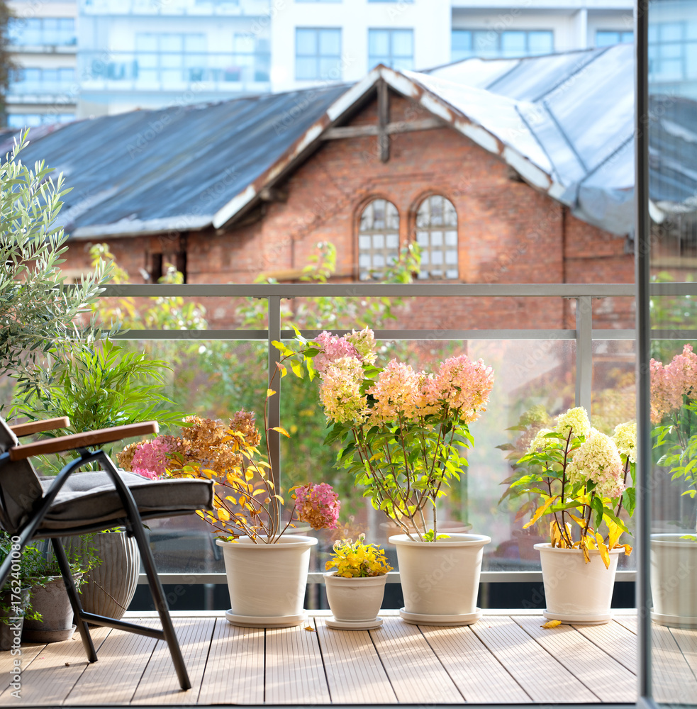 Hydrangea flowers on a city balcony in autumn. Potted plants on a wooden terrace with sunlight and urban background. Cozy outdoor space with fall colors, leaves, and natural light on a modern balcony. #1762401080