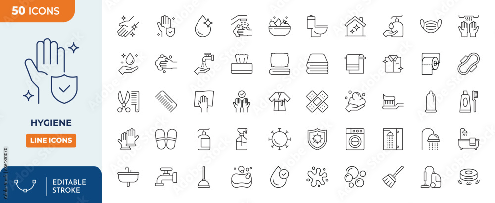 Hygiene Line Editable Icons set. Contain icons related to Hygiene, clean, sanitary, towel, wash, liquid , and more. Editable stroke. Vector illustration #864891070