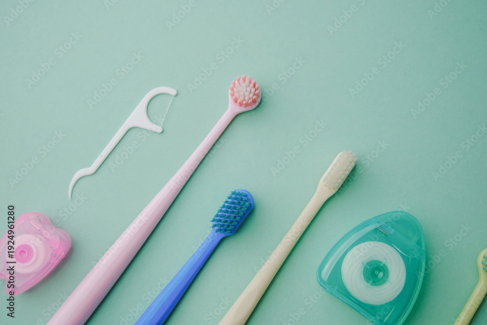 Hygiene tools arrangement of toothbrushes and dental floss on a pastel background for oral care #1924961280