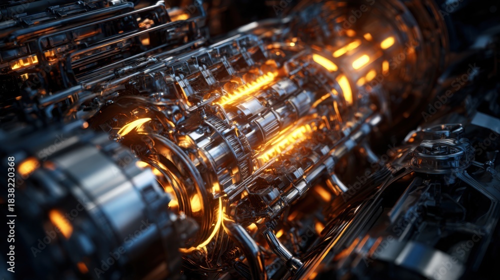 hyper detailed modern car engine cutaway, dense complex internals, glowing oil channels, high tech precision, futuristic metallic textures, dramatic #1838220368