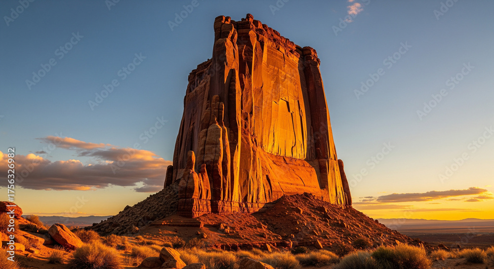 Iconic Desert Butte Bathed in Golden Hour Sunset Light A spectacular, low-angle photograph capturing a massive sandstone butte or mesa in a desert landscape, strongly reminiscent of Monument Valley #1756326982
