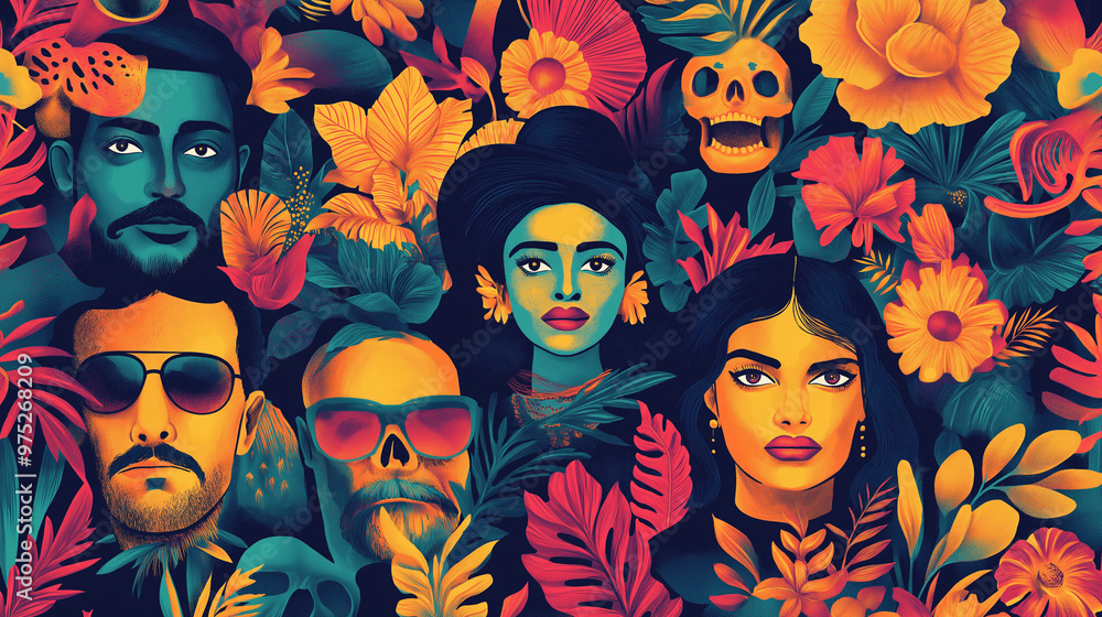 Iconic Latin American Writers, a literary pattern featuring symbolic elements related to Gabriel Garc�a M�rquez, Pablo Neruda, and more, with copy space #975268209