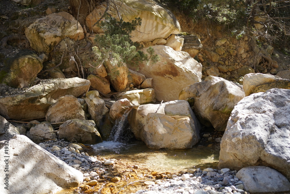 Idyllic water with small cascades and pooles surrounded by oleander and pine trees at Avakas Gorge Canyon #1932601520