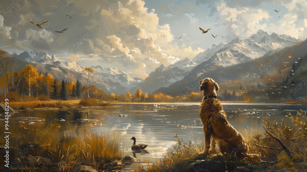 il Painting Style Print of a Hunting Dog Watching Ducks Flying - Hunting Scene, Natural Landscape Art #944140299