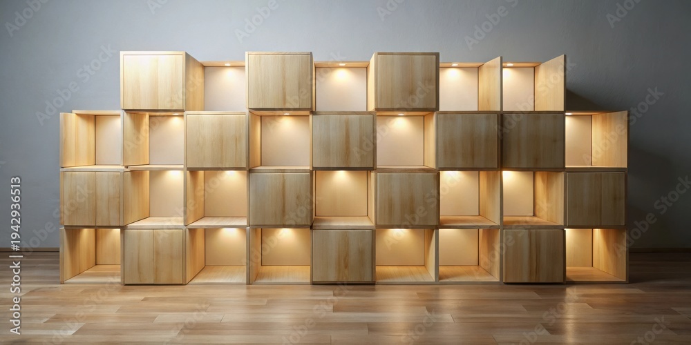 Illuminated Modular Wooden Shelving Unit with Soft Interior Lighting Creates a Warm and Inviting Atmosphere in a Modern Room #1942936513