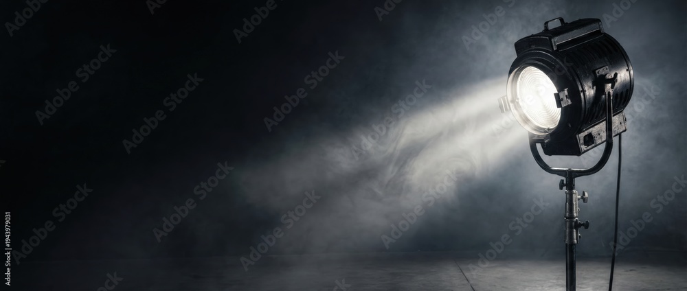 Illuminating stage action spotlight studio photography dark environment close-up view concept of focused light for creative projects #1943979031