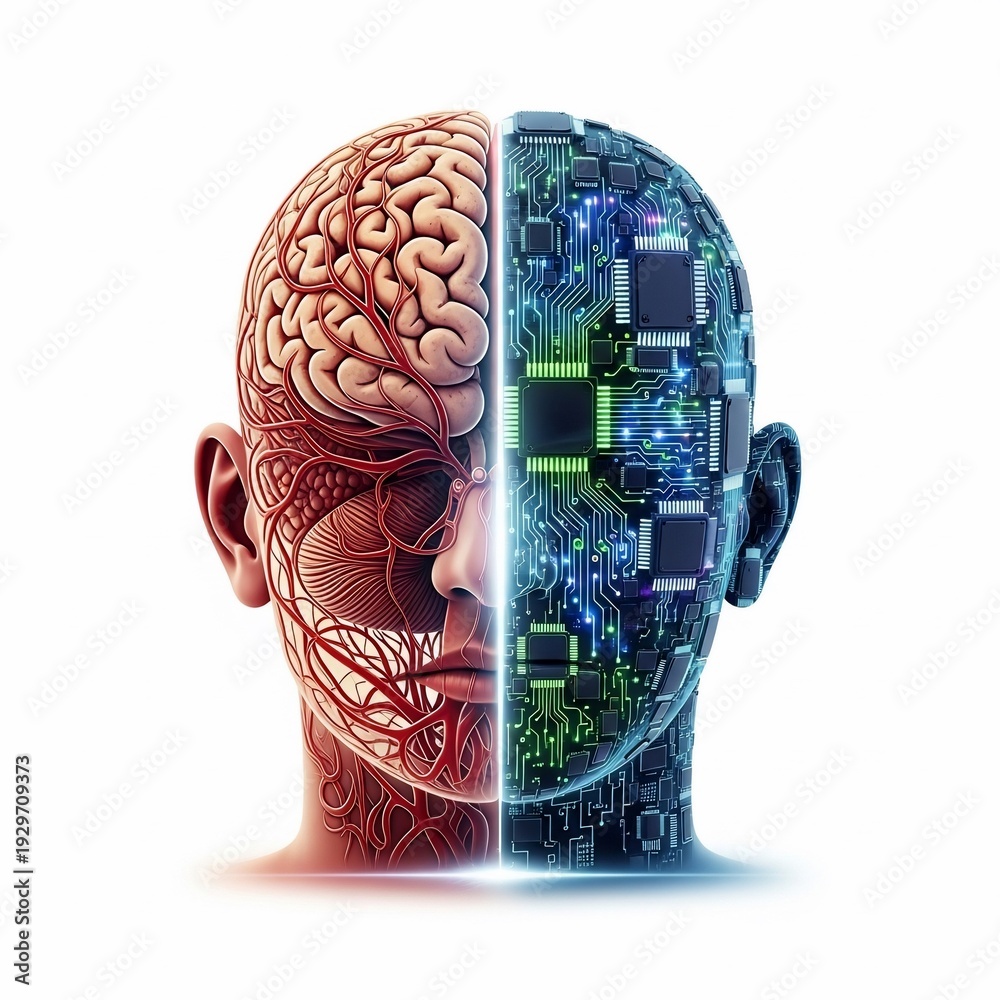 Illustrating the profound synergy of human biology and artificial intelligence, this conceptual art piece visualizes the intricate connection between organic thought and advanced digital processing #1929709373