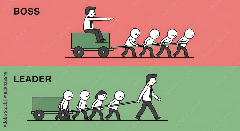 Illustration comparing a boss who directs from a cart pulled by employees versus a leader who pulls alongside them Background image #1829423549