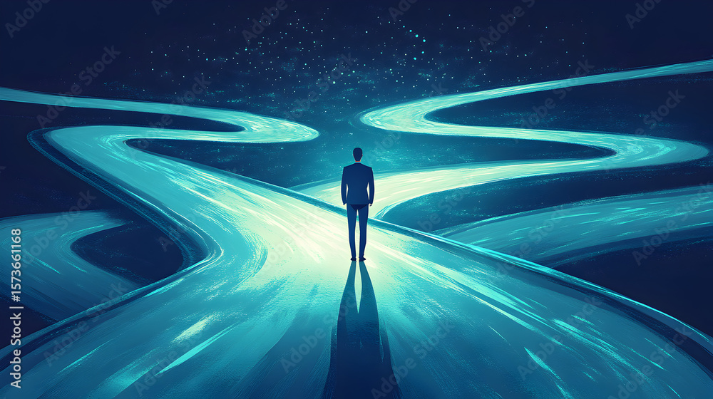 Illustration of a confused businessman facing multiple career and business growth paths, embodying the paradox of choice concept with numerous routes and decision dilemmas 54562156 4 #1573661168