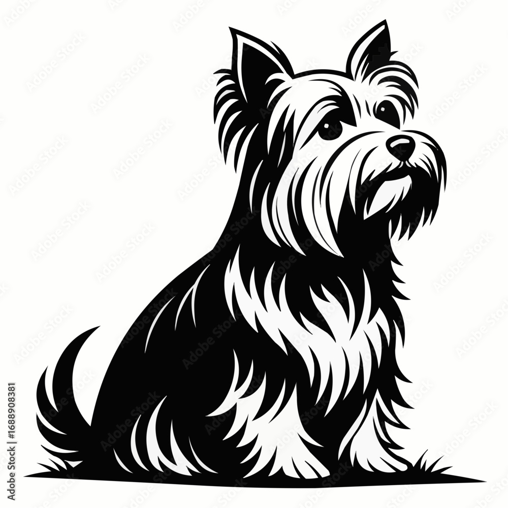 Illustration of a yorkshire terrier sitting with detailed fur in black and white color scheme design #1688908381