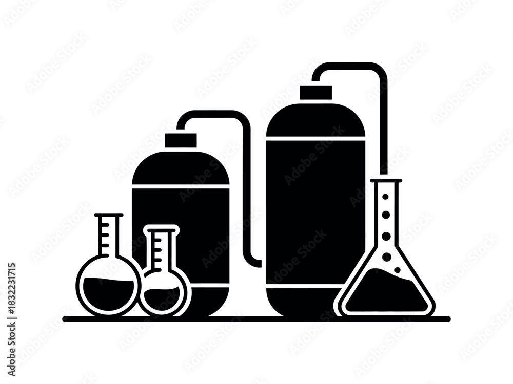 Illustration of chemical laboratory equipment including flasks and tanks in black #1832231715