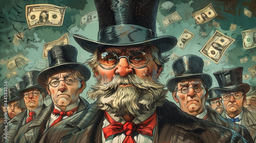 Illustration of greedy capitalists with dollar bills in the background #944583834
