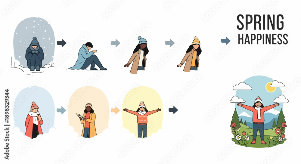 Illustrative journey depicting seasonal depression, showing person's mood shift from winter melancholy to spring joy. Concept portrays seasonal depression, transitioning from cold, #1898329344