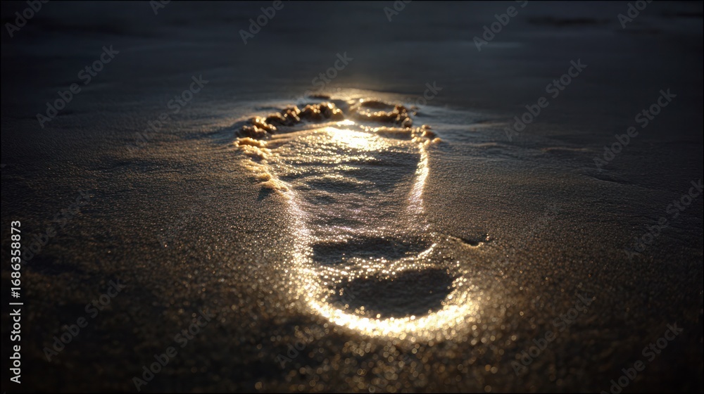 Imprint of a single footstep in moist sand, displaying even pressure distribution with a soft therapeutic glow. #1686358873