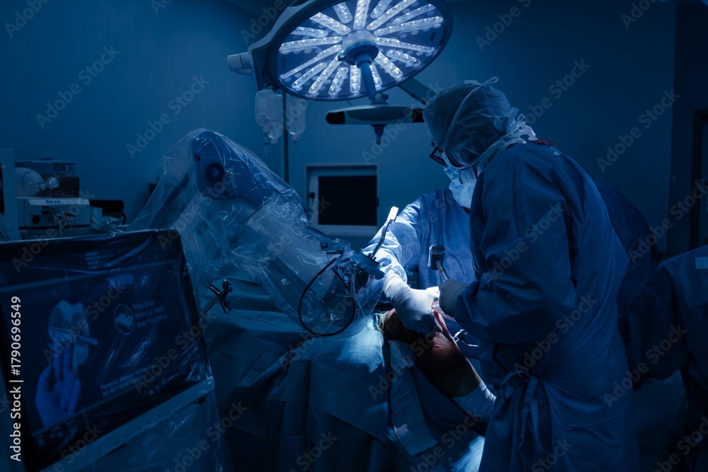 In a brightly lit operating room, surgeons use robotic technology during a knee replacement. A screen displays planning data, assisting with precision and personalized alignment #1790696549