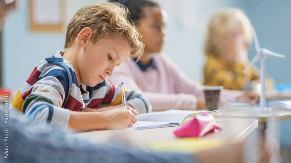 In Elementary School Classroom Brilliant Caucasian Boy Writes in Exercise Notebook, Taking Test and Writing Exam. Junior Classroom with Group of Children Working Diligently and Learning New Stuff #370984610