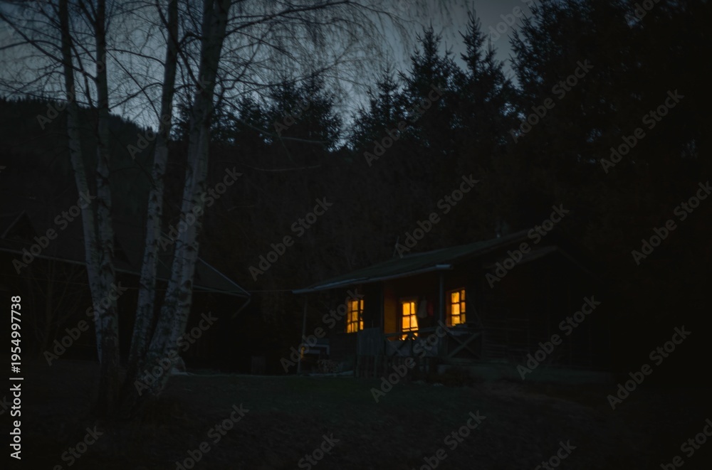 In the stillness of night, a rustic cabin stands quietly in the woods, bright windows glowing like friendly beacons. Tall trees frame the scene, enhancing the serene beauty #1954997738