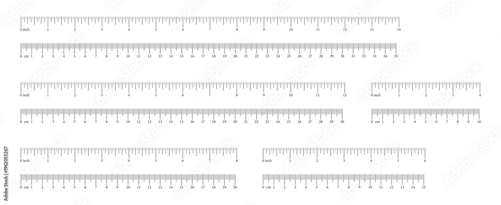 Inch, metric rulers from 4 to 14 inch, 10 to 35 cm. Measuring tool template. Scale for ruler centimeters, inches. Inches, centimeters measuring scales. Metrics indicator cm, inch. Measuring scale icon #1962055267