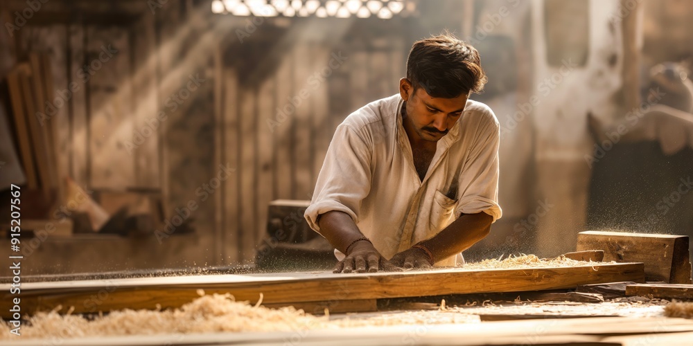 Indian Carpenter Skillfully Crafting Woodwork in a Sunlit Workshop #915207567