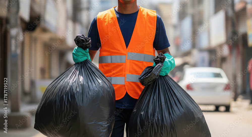 Indian male worker in orange vest holding black garbage bags #1787119522