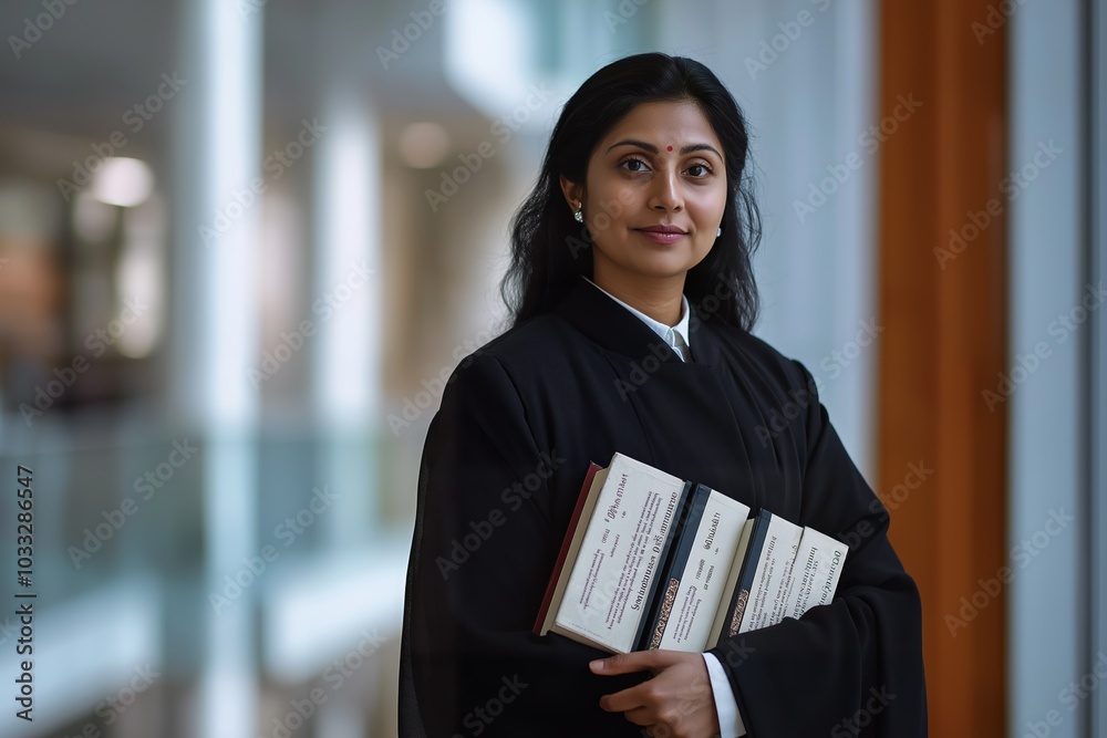 Indian woman lawyer in black robe holding legal books, exuding professionalism and authority #1033286547