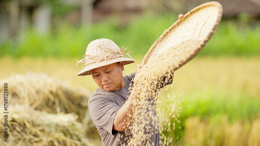 Indonesian woman farmer winnowing or sifting harvested rice grains in paddy field, straw hat, rural indonesia, women in agriculture, southeast asia #1768123850