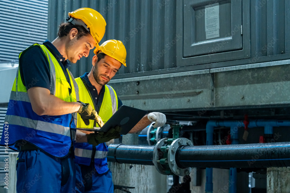 Industrial engineer teamwork maintenance pipeline valves air HVAC cooling systems at construction site. Male technician in safety uniform inspect building exterior pipeline valves or plumbing systems. #1646357429