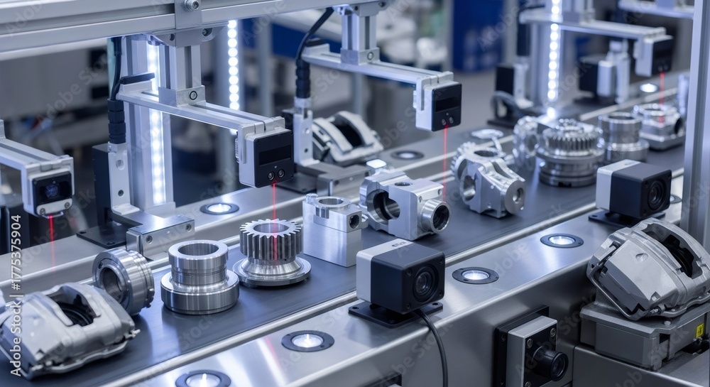 Industrial robotization: machine vision system with laser for quality control of spare part on conveyor belt. Automated production inspection technology concept. #1775375904