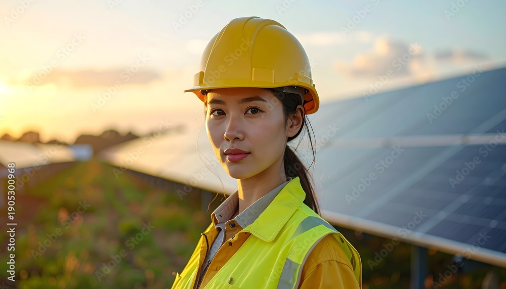 Ingeniera con casco y chaleco reflectante en planta solar al atardecer, energía fotovoltaica y liderazgo femenino #1905300968
