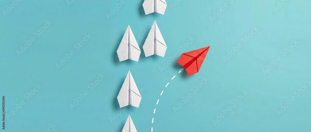 Innovative leadership action a red paper airplane taking off amidst white ones creative concept digital art light blue background inspired viewpoint #1945103096