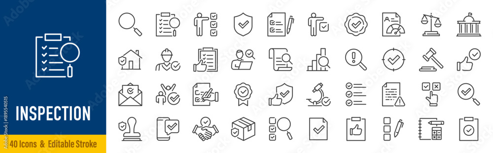 Inspection web icons in line style. Examination, testing, quality control, check, inspect, collection. Editable stroke. Vector illustration. #1895540515