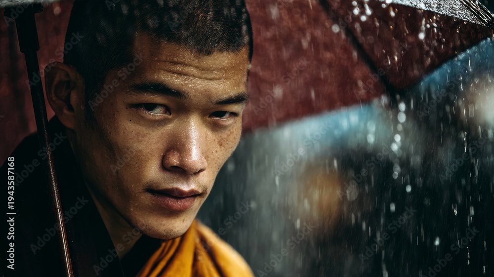 Intense Portrait of a Young Man Holding an Umbrella in Rain with Focused Expression and Wet Background Captured in a Dramatic Light Setting #1943587168