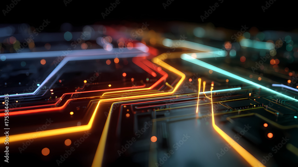 Intricate circuit board with glowing lines and vibrant colors, symbolizing data flow #1755844035