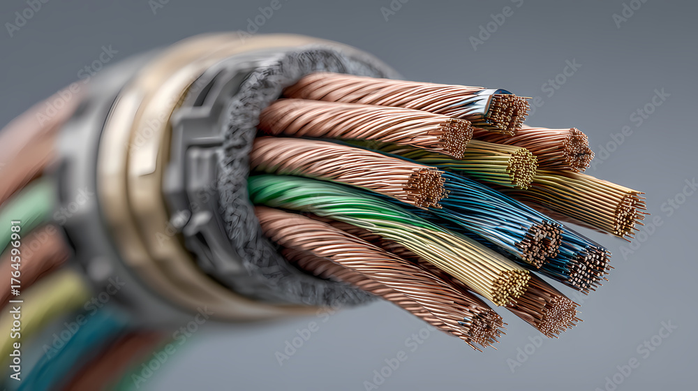 Intricate detail of a multi-colored electrical cable, revealing its internal structure, including many small copper wires. This image shows the importance of wiring in infrastructure. #1764596981