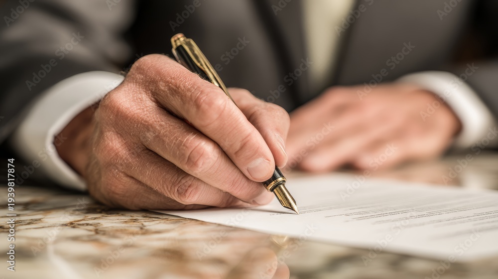 Investor signs financial agreement at marble desk in soft light with gold pen detail, showcasing wealth management focus #1939817874