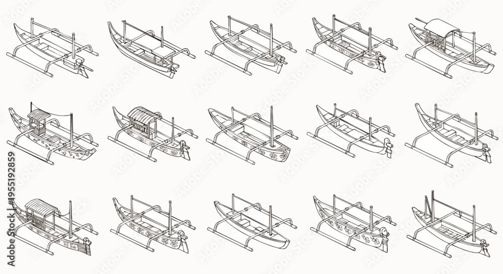 Isometric line art vector set of traditional Indonesian or Southeast Asian outrigger fishing boats. Detailed wireframe illustrations for design projects. #1955192859