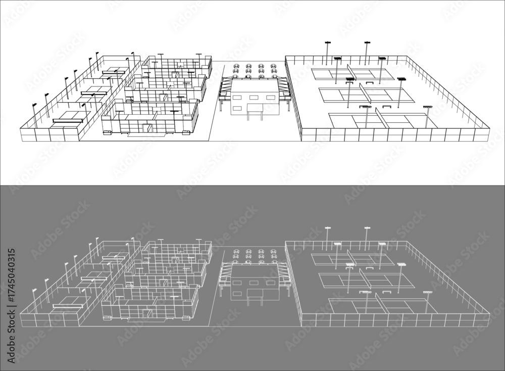 Isometric line drawing of a modern multi-sport complex featuring tennis, padel, and pickleball courts #1745040315
