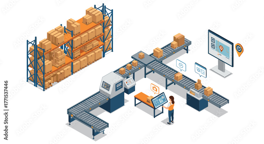 Isometric warehouse automation with conveyor belts and digital interfaces #1771537446