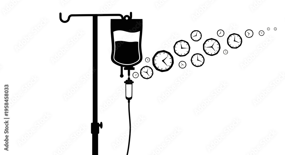 Iv drip with clock icons flowing through tube on medical stand #1958458033