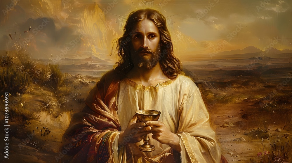 Jesus, glowing softly with divine light, holding his hand up in rejection of a chalice offered by Satan, the barren desert symbolizing the emptiness of the temptation and the strength of spirit. #1073696931