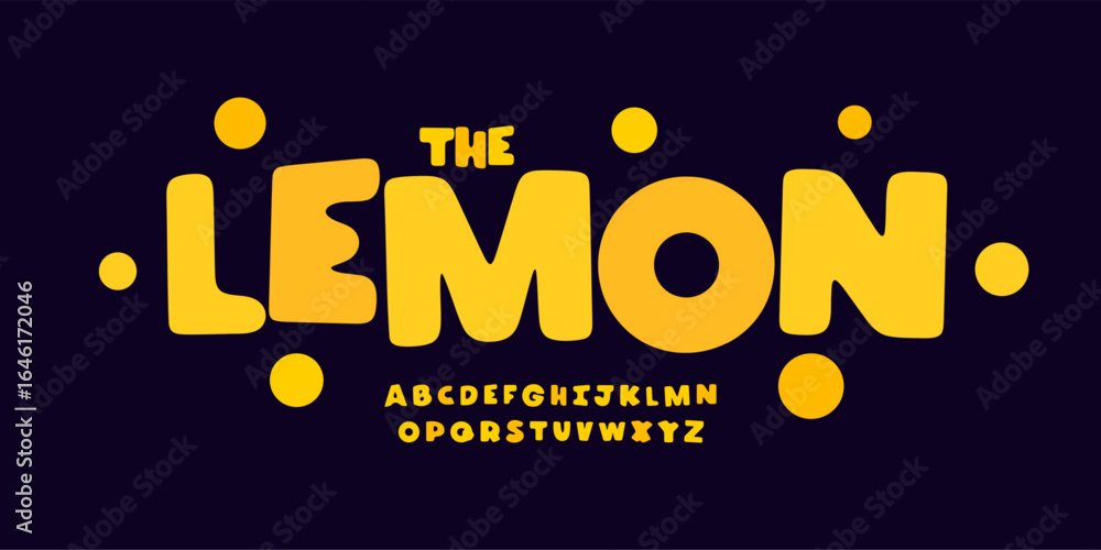 Juicy bubble alphabet, bold rounded sunny font, yellow cartoon font for sticker logo, summer sign headline, playful typographic design, modern fluffy heavy vibrant typography. Vector typeset. #1646172046