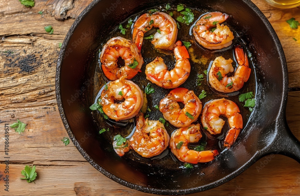Juicy Shrimp Cooked in Garlic and Herbs in a Cast Iron Skillet on a Wooden Table #1708689571