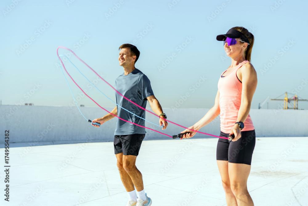 Jump rope workout on a rooftop with two active individuals enjoying fitness #1749554382