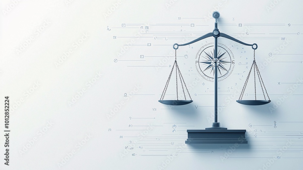 Justice scales with a compass, guiding moral decisions, flat design illustration #1012852224