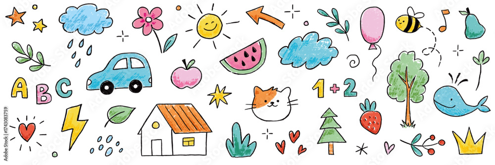 Kid crayon child hand drawn background. Crayon pencil stroke school doodle flower, cartoon sun, rainbow summer elements. Kid style cute star, tree, heart shapes background. Vector illustration #1743083759