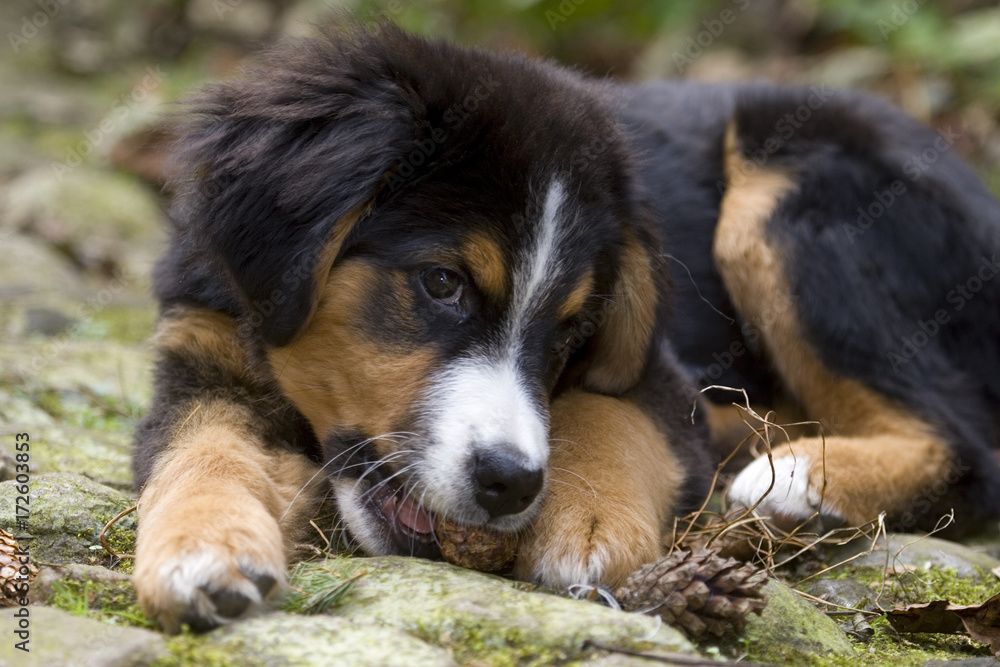 Kleiner Welpe kaut an einem Tannenzapfen #172603853